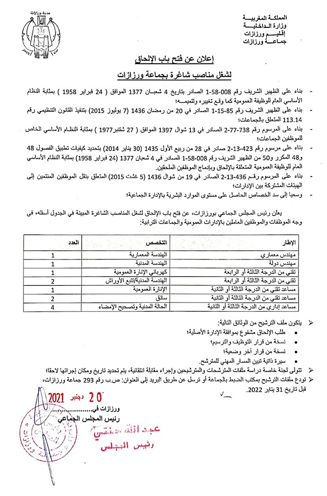 إعلان عن فتح باب الإلحاق لشغل مناصب شاغرة بجماعة ورزازات