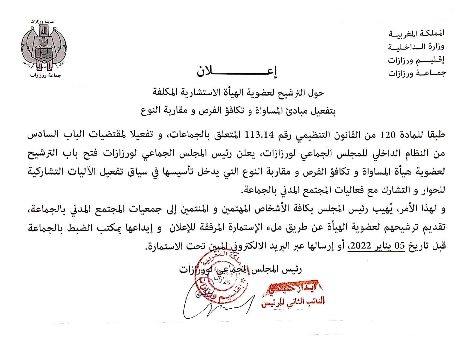 اعلان الراغبين في الانضمام لعضوية هيأة المساواة و تكافؤ الفرص و مقاربة النوع بالمجلس الجماعي